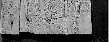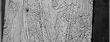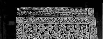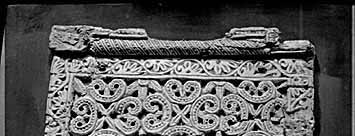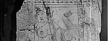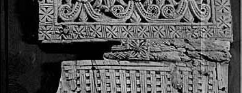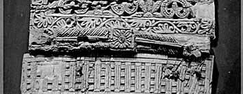 Photo : Thewalt 1969 (p7_69_02) [ Vgl. Francine Tissot 2006, Catalogue of the National Museum of Afghanistan 1931-1985, UNESCO publishing 2006, Paris, pp. 179, 181: K.p.Beg. 375.115./K.p. Beg. 381.121a Exc. no. 34a3. K.M. inv. no. 58-1-70, H 0.256; Engraved ivory, Large plaque. G. 8131562/3; MDAFA, XI, figs. 18, 21 & 658; D.D.B. 103.231. Drawing of Pierre Hamelin. Detail of the back of sofa 34/Two women dancing and playing a drum, vedika on top. Sofa 34 This large sofa was decorated on both sides with ivory and bone plaques and friezes (fully illustrated). These elements were fixed to the wooden armature with copper nails. Large mica leaves were placed between the ivory and the wood. Long gilded copper prongs introduced at the left and right extremities of the back of the sofa strengthened the structure of plaques and bands. The upper edge of the back of the sofa was protected by double ivory bars, fixed with iron nails. Vertical bands were added at the left and right ends, and a sonsole carved with monsters in the round was fixed to each side. Begram (Kapisa province) Begram was a large city, probably a royal town, situated some 80 km north of Kabul, in the province of Kapisa. When the ivory and bone pieces were first discovered in the Begram treasury in 1937, they were thought to be elements from luxury furniture belonging to a king, or more particularly his queen. However, neither the architectural elements nor the situation of the site seem to indicate that the building could be identified as a royal residence. The pieces of the treasury may therefore be identified as precious goods belonging to an important merchant to be sold or presented to wealthy people or perhaps to some petty sovereign or the king. This problem has to be studied anew. The ivory and bone furniture was made of carved, incised or engraved pieces, possibly painted (red and black), fixed to wooden frames with copper nails. Most of these elements have been found, although they are in very poor condition. Since the wooden settings had practically disappeared, the ivory pieces were often reduced to tiny fragments. I have listed the pieces in the order adopted by the excavators when publishing them in 1939-54, in other words, reconstituting (as far as possible) each fragment belonging to a chair, a chaise longue, a stool or a little coffer. These ivory pieces show marked similarities with the luxury furniture depicted in the carvings from Mathura and Amaravati of the same period (second half of the first century and the second century AD or perhaps a little later). The Original photographs, in situ, together with the reconstruction of some pieces by Pierre Hamelin (see MDAFA, XI), allow us to gain an understanding of these magnificent masterpieces of ancient furniture. One of them, chair 161 (M.K. inv. no. 58-1-101; see K.p.Beg.264.4), beautifully reconstructed, was on display in the Kabul Museum before the last war.