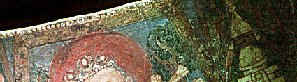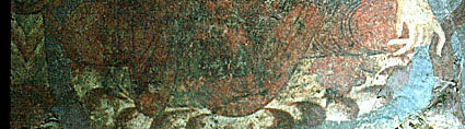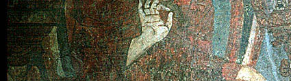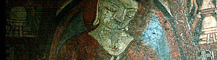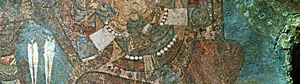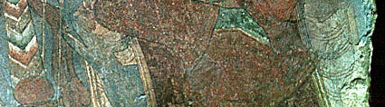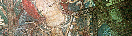 T.Sh.p.Ka. 227.1. Exc. no. K.15, H 0.60; Painted clay. MDAFA, III, Pl. LXXII, fig. 86; ROW, 71, figs 145-46; Tarzi, B 160. The hunter-king facing, accompanied by his dog. A second Buddhist monastic site was excavated in the Kakrak valley south-east of Bamiyan. Along with a smaller Buddha statue than those of Bamiyan, some dwellings of Buddhist monks were found in the main precinct. The paintings in the grottoes were removed and taken to the Kabul Museum by Joseph Hackin. The best known is a figure of the 'hunter-king' and his dog. The site is thought to date a little later than the main site in Bamiyan. |