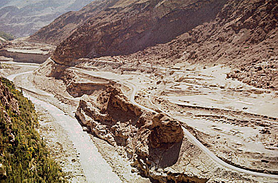 und den Karakorum-Highway. Rechts von der Straße die Reste eines chinesisch-pakistanischen Straßenbau-Lagers.